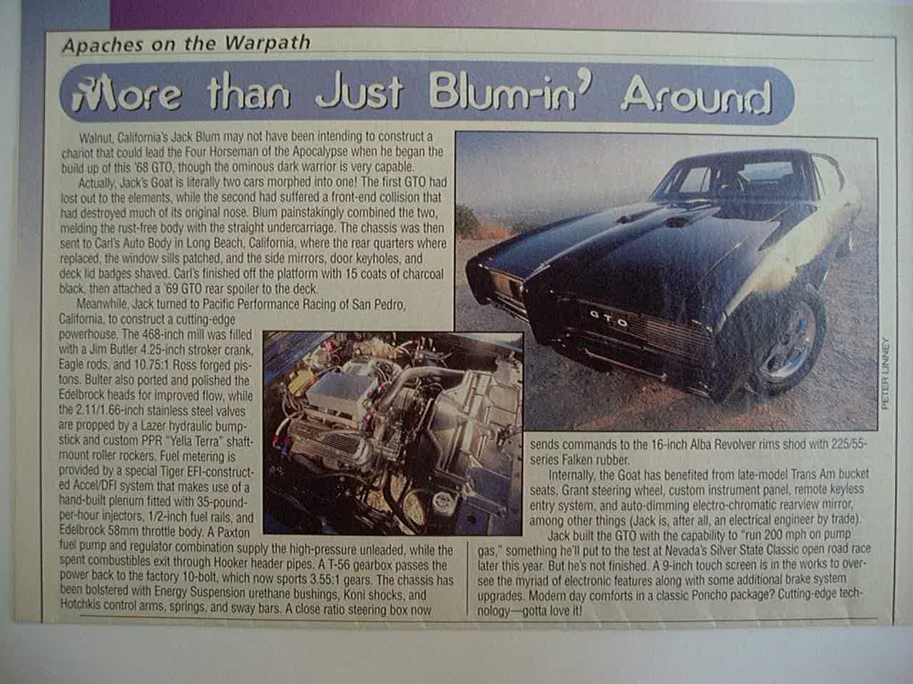 | July 2000 Black Tiger in Popular Hot RoddingPart of a feature of modified Pontiacs page 78My buddy Otto Tharp called me and told me to check page 78 of PHR. When I saw it I was amazed. The writer of the HPP article told me that it may show up in other articles and magazines, but I thought they would call and tell me or something. It was a nice surprise. Here is a copy of the article.